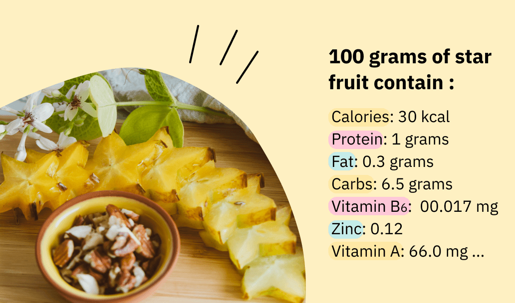 Start QuizCarambola fruit is almost 90% water. So it is a low-calorie product. Nutritional value per 100 g contains1NutritionData. (2018). Carambola, (starfruit), raw Nutrition Facts & Calories. NutritionData. Retrieved from https://www.nutritionix.com/i/usda/carambola-starfruit-raw-1-cup-cubes/513fceb475b8dbbc21000ff0: